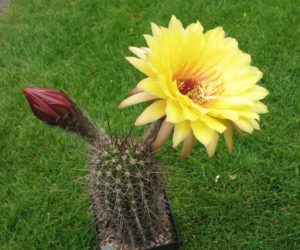 An dieser Pflanze finde ich den kompakten Wuchs und die stabile Blüte sehr ansprechend. Der Pflanzenkörper ist derzeit 13 cm hoch. Das Verhältnis von Körpergröße zu Blütendurchmesser wirkt auf mich sehr ausgeglichen. So sollten Trichocereus-Hybriden sein. 😉 Leider gibt es auch jede Menge andere Beispiele, wo die Pflanzenkörper eine unhandliche Höhe erreichen. Diese Pflanze hat jedoch gute Aussichten, sich noch eine ganze Weile in meinem Gewächshaus wohlfühlen zu dürfen. Der Nachwuchs über Ableger scheint zudem gesichert zu sein.